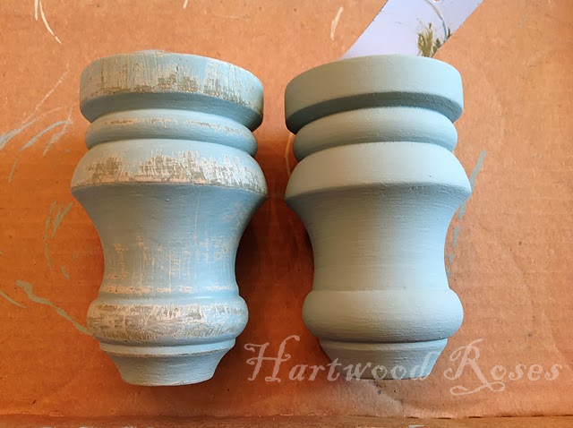 Replacing the missing feet on the cupboard was easy. I bought four unfinished wood feet at Lowe's, and I went to work painting them to match the finish on the cupboard. ('Olive', then 'Country Grey', then 'Duck Egg'.) I distressed the feet very heavily, since feet on a piece of furniture receive lots of abuse from brooms, mops, vacuum cleaners, shoes, etc.
