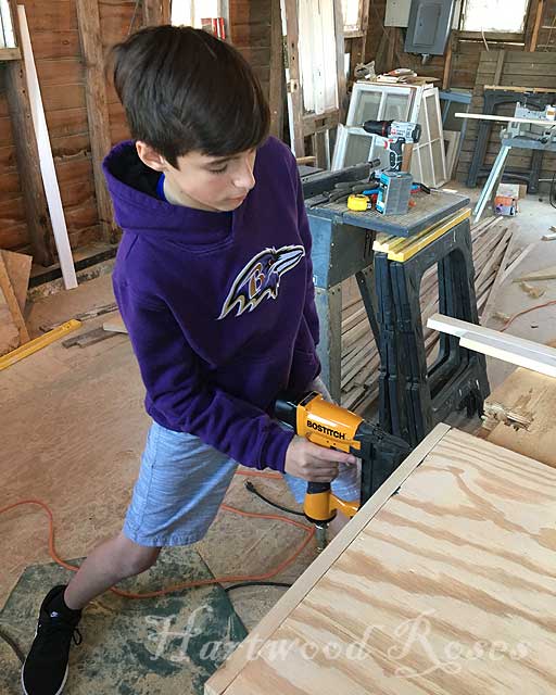 Couldn't resist adding this photo of our grandson, learning to use a brad nailer to attach the trim around the roof.