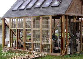Edited to add:  This greenhouse is a testament to using salvaged materials.  All of the windows, the skylights, and most of the lumber was scrounged from various sources.  I designed it to make most efficient use of the materials I had collected ... to use salvaged materials, but make it look like a million bucks!